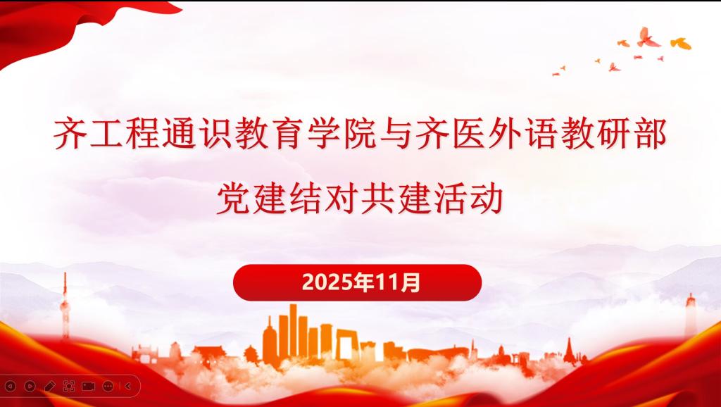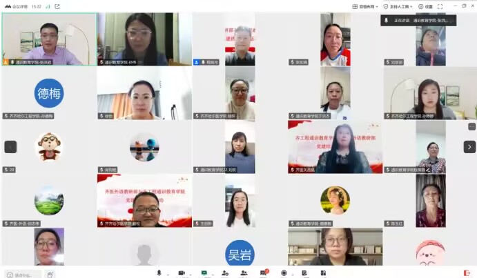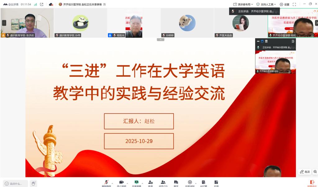 11月6日,齐齐哈尔工程学院通识教育学院党支部与齐齐哈尔医学院联合第三党支部共同举办了以“结对共建聚合力,党务业务深融合”为主题的党建结对共建活动。本次活动在线上进行,两支部以虚拟教研室为平台,围绕以微专业建设为主题的教学改革和外语“三进”工作展开交流,深入推进跨校党建联动与教学资源共享。此次活动由通识教育学院党支部书记张洪岩主持,齐齐哈尔医学院联合第三党支部书记程前光及所属支部党员全程参与,通识教育学院党支部全体党员及大学外语教研室全体教师参加,共40名教师,其中党员教师31人。